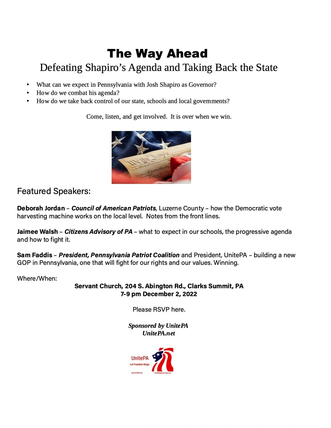 Please join us as we discuss the way forward and how we defeat Shapiro's and the left's agenda for PA. Servant's Church, Clarks Summit, PA – 7 - 9 PM December 2nd.