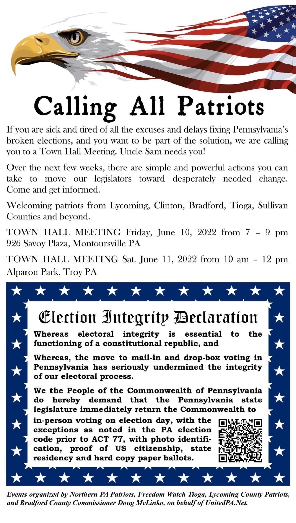 Members representing over seventy PA-based patriot and constitutional groups are going to visit the offices of all of our PA representatives and senators on Flag Day, 14 June 2022 to demand our legislators return PA to pre-ACT 77 in-person voting.